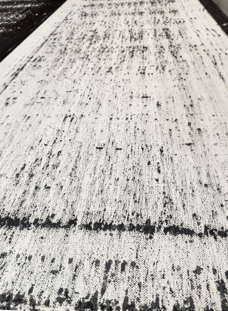 In other words, when we post a message via phone or another device, we type our words on a screen and keyboard, while behind the user interface runs code that most people cannot read. If Rosa Menkman exposes hidden structures by creating “glitches,” I mimic the structure itself: my body becomes the printing mechanism, a human printer transferring characters and information. Like a cog in a rational machine, my mechanical labor symbolizes the endless copy-and-paste of its underlying parts. Yet, because my arm cannot reproduce itself perfectly, I inevitably introduce variations in position, angle, and pressure—millions of tiny white points accumulate on the surface, and the viewer faces what looks like a snowy, malfunctioning screen.