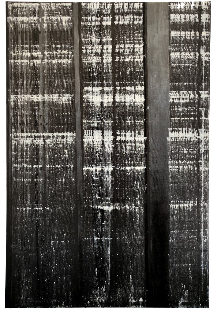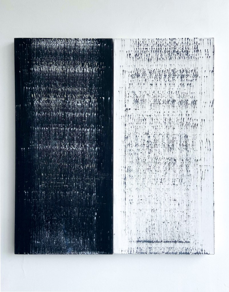 The 0/1 Series is a process-led body of work that translates digital language into physical gesture. Each piece begins with a word—such as produce or consume—converted into binary code (0s and 1s). Using a custom 3D-printed brush, where narrow and wide teeth represent these digits, I “print” the encoded patterns onto black canvas. Through this repetition, I become a living machine, transforming data into pigment, gesture, and pressure.