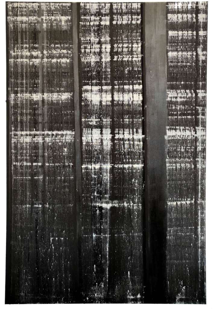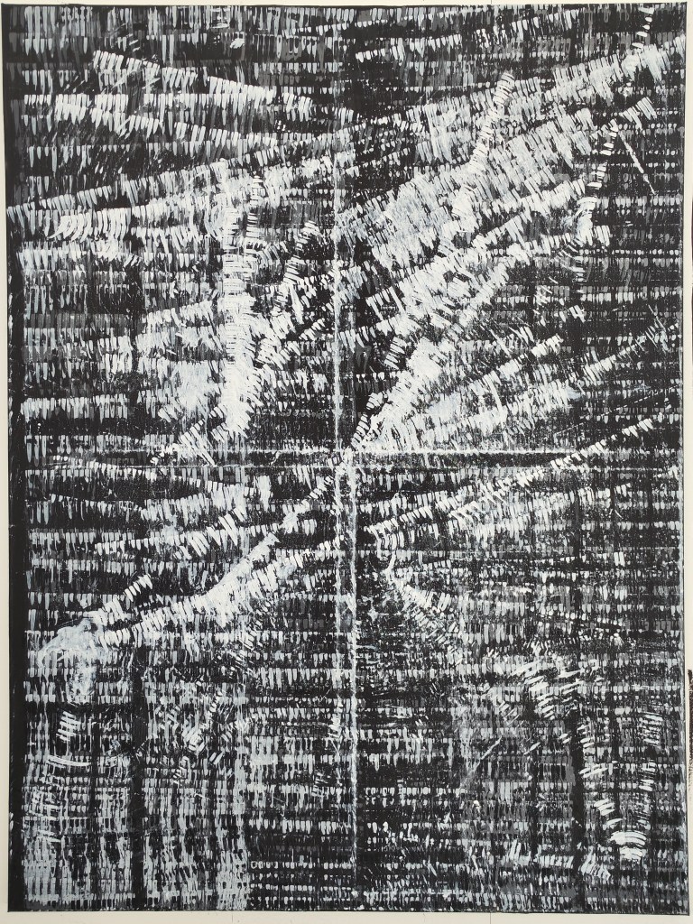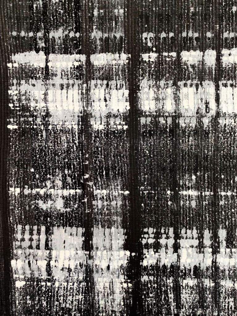 Communication was no longer expressed through recognizable language but through the binary substrate beneath it. Each stroke embodied both pigment and pressure, both intention and mechanical repetition. The act of “sending” became a sequence of bodily transmissions—manual yet systematic, imperfect yet rhythmic. The resulting surfaces resembled malfunctioning CRT displays: flickering, dense, and glitch-like. But the “error” here was not simulated through digital effects; it was produced by the human body itself—through tremor, fatigue, and micro-variations of force.