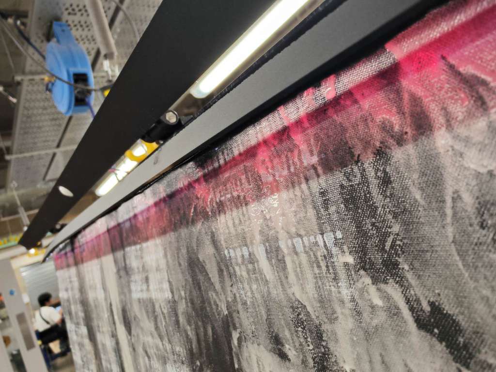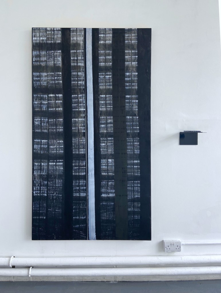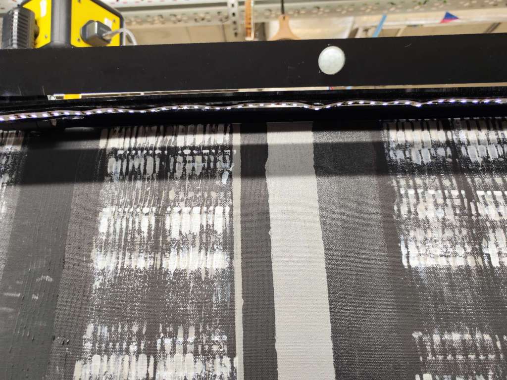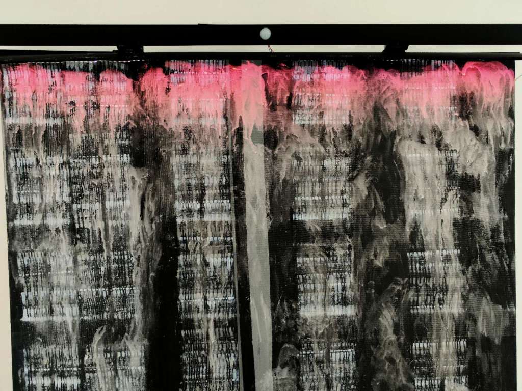 Unfortunately, due to the limited power of the 12 V UV strip, the light could not cover the full 180 cm width of the canvas—only a small portion was effectively activated. As a result, for the final MA Show, I exhibited the painting alone without the interactive light component. Nevertheless, the experiment provided a valuable learning experience. Through this process, my inquiry shifted from what to paint toward what constitutes a painting—from surface representation to the material and technological conditions that allow painting to exist.