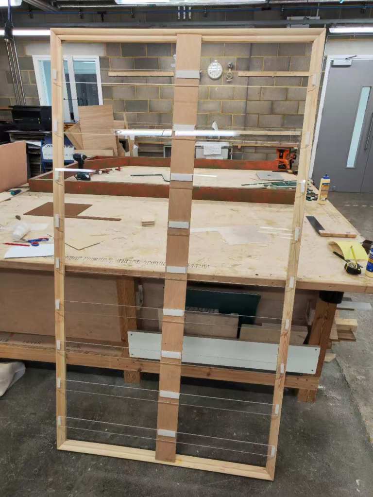 To house the lighting system, I designed a black structural casing with three hinged panels that could seamlessly attach to the canvas surface . The final 3D model visualised how the piece would appear in a darkened exhibition space.