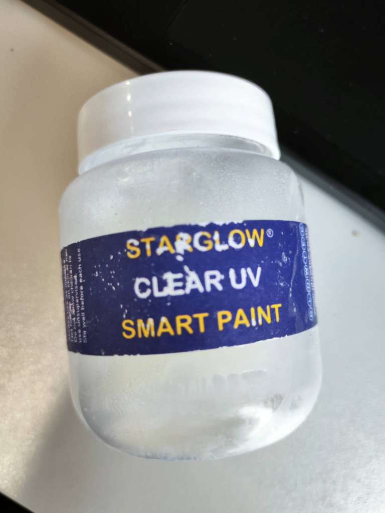 Further research led me to experiment with fluorescent pigments, materials that reveal completely different colours only when exposed to ultraviolet light. For instance, white or transparent pigments could suddenly glow red or green under a specific wavelength. I used STARGlow fluorescent pigments in combination with a 365 nm UV LED strip sourced from the United States. The UV light, almost invisible to the naked eye, activated hidden chromatic shifts on the canvas—an effect both subtle and uncanny.